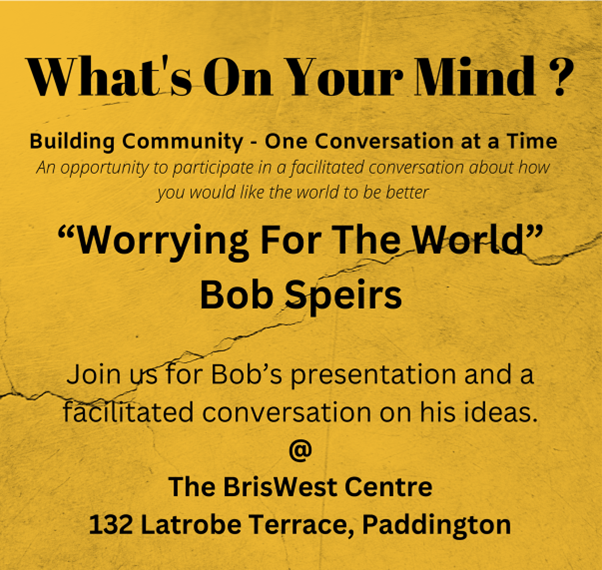 Guest speaker Bob Speirs, a climate risk and adaptation adviser, will lead us in a facilitated conversation as we explore the topic ‘Worrying For the World’ in the December edition of “What’s On Your Mind?”